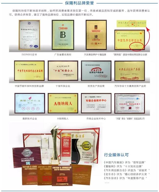 2017年已推出了,汽車空調(diào)蒸發(fā)箱可視清洗套裝、新車蠟、機(jī)動(dòng)車制動(dòng)液、無(wú)香型表板蠟等數(shù)十款廣受市場(chǎng)青睞的暢銷汽車美容養(yǎng)護(hù)產(chǎn)品。