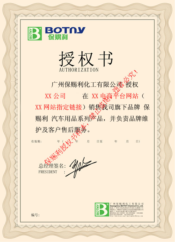 1、請各位網絡買家在購買廣州保賜利化工有限公司旗下系列品牌之系列產品時,選擇正規、正品網店進行購買,我司已對銷售我司產品網絡銷售商予以審查,并對合格網銷商簽發專屬網絡銷售運營授權書,為維護廣大網絡買家權益,我司在本平臺予以公布授權書標準版本,以供大家購買保賜利產品時鑒別正品賣家。(授權書標準版本請見本頁下示圖片)